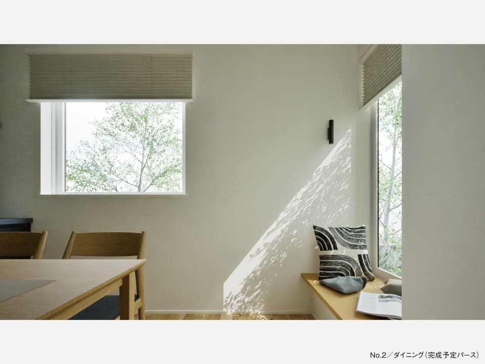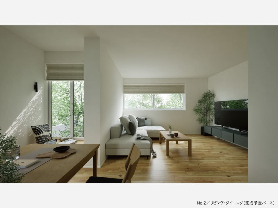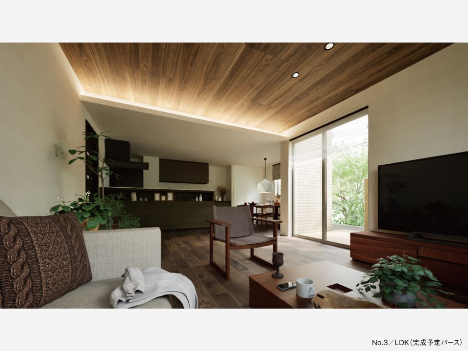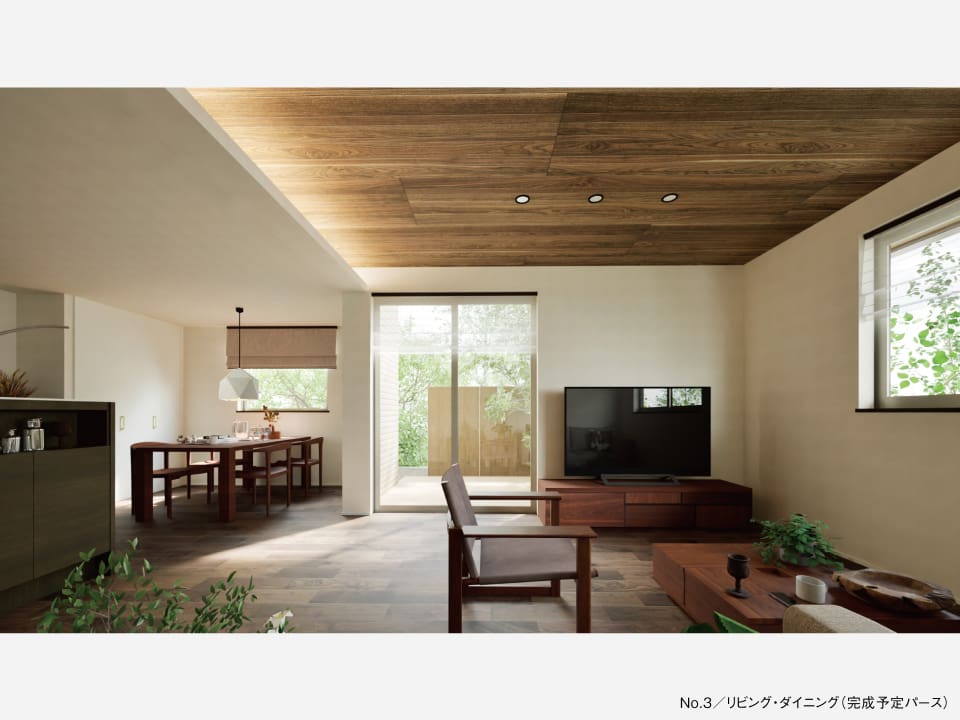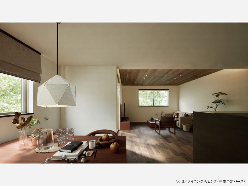 ※掲載のCGパース、間取り、外構図は図面を基に描き起こしたものです。植栽の様子には、予定種の概ね3年後のイメージに近い画像を用いておりますが、販売時は苗木や緑量の少ない状態となります。ご購入後の植栽の育成には数年を要するものもありますし、成長後の形状も様々となります。また、記載の家具・家電・小物・車は販売価格には含まれません。