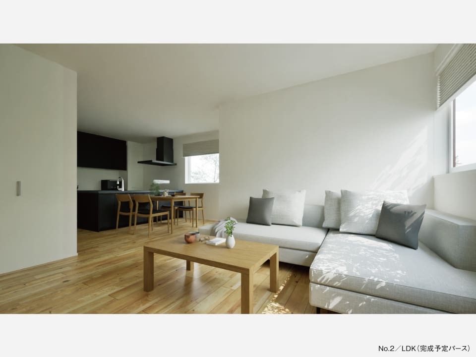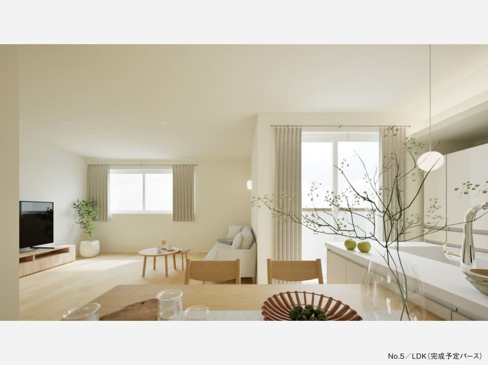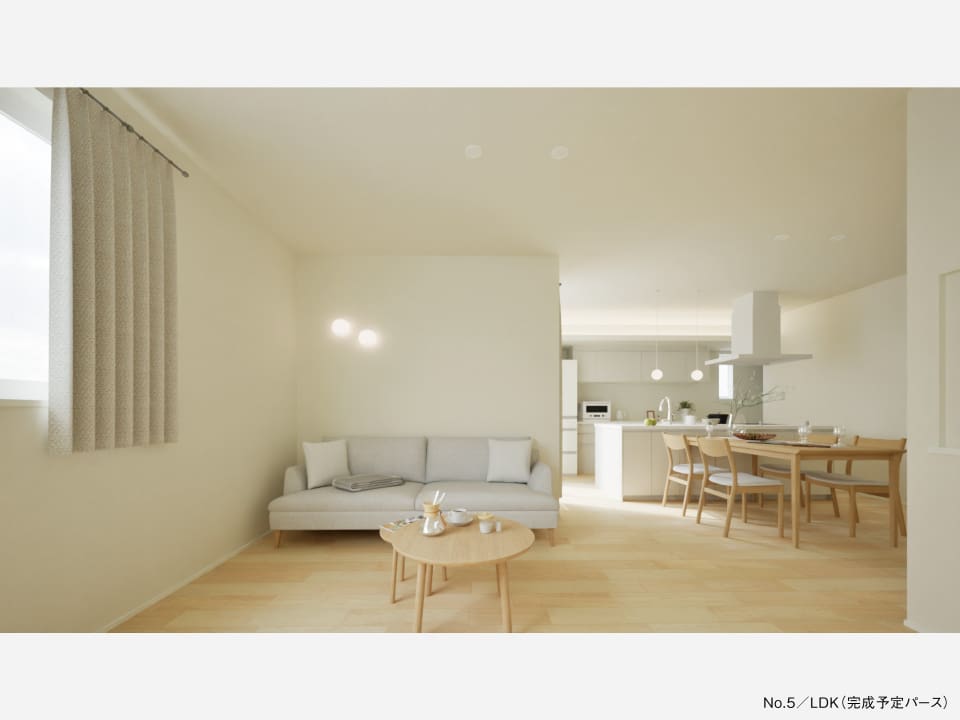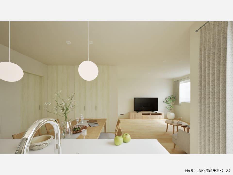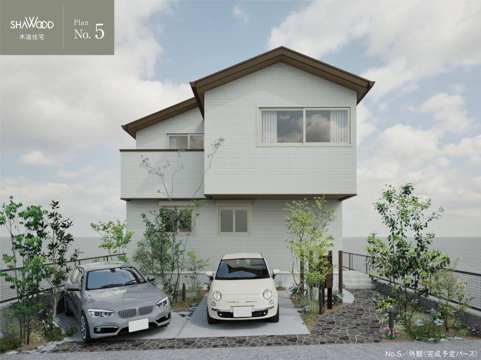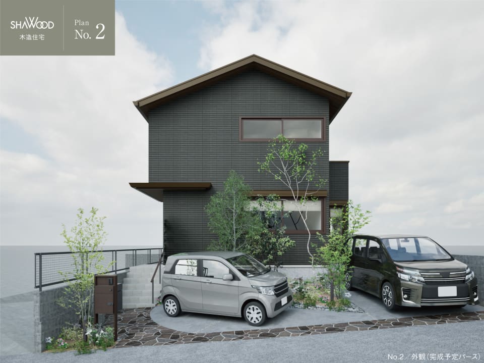 ※掲載のCGパース、間取り、外構図は図面を基に描き起こしたものです。植栽の様子には、予定種の概ね3年後のイメージに近い画像を用いておりますが、販売時は苗木や緑量の少ない状態となります。ご購入後の植栽の育成には数年を要するものもありますし、成長後の形状も様々となります。また、記載の家具・家電・小物・車は販売価格には含まれません。