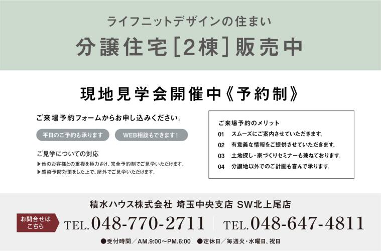 積水ハウス株式会社 埼玉中央支店定休日:火曜日、水曜日及び祝日 営業時間:9:00~18:00