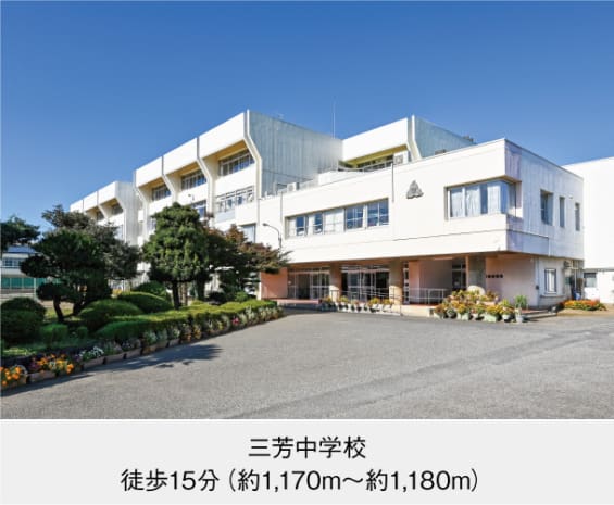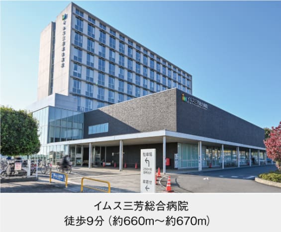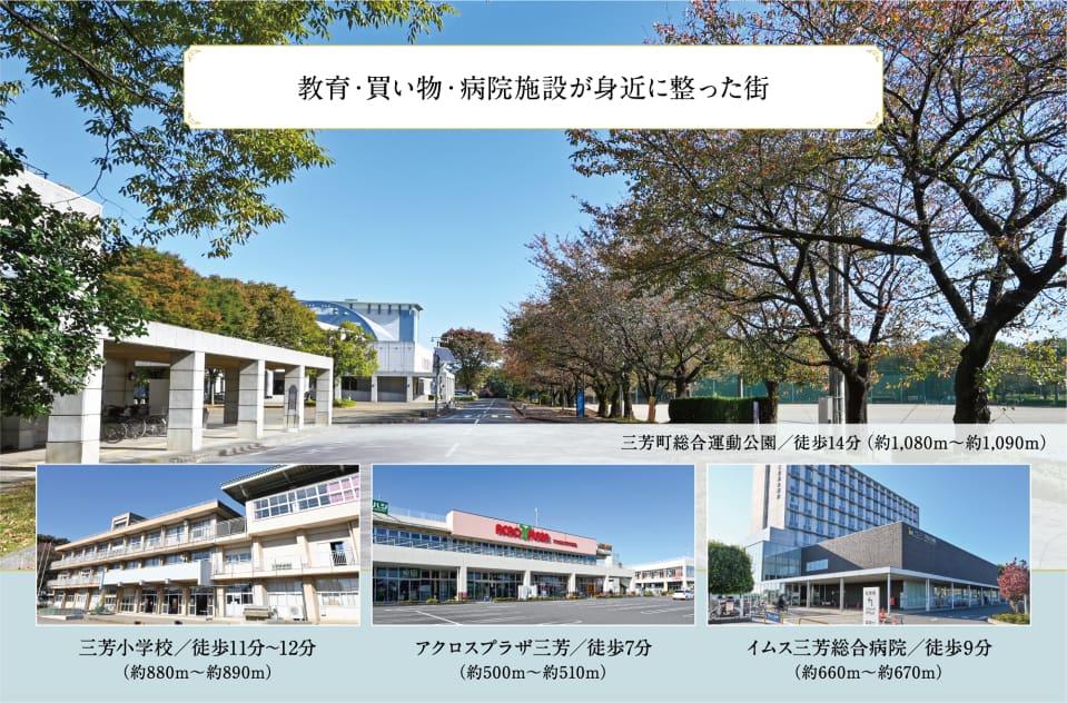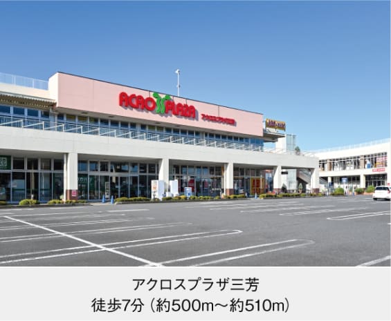 - アクロスプラザ三芳(約500m〜約510m)をはじめ、イオン大井店(約3250m〜約3260m)や、ららぽーと富士見(約3530m〜約3540m)があり、週末のショッピングを楽しめます。