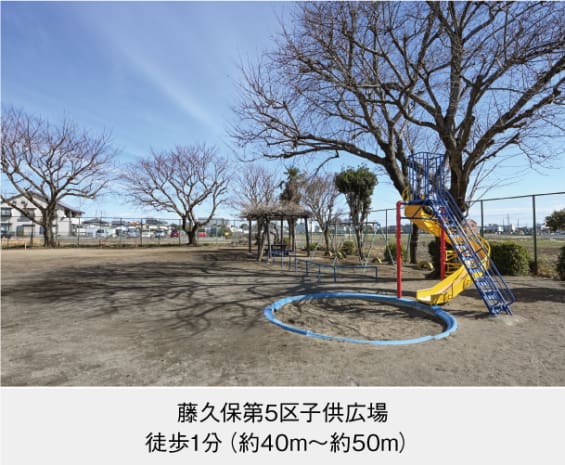 分譲地の南側にある広場。グラウンドや遊具、桜の木があり、地域の憩いの場として親しまれています。
