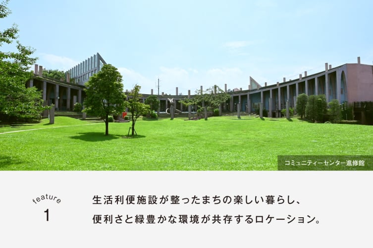 ![]() 商業施設や教育・公共施設、医療施設が整った住環境。便利さと、緑豊かな心地良さを享受できる穏やかな暮らし。子育て世代がのびのびできるまちで、四季折々の自然に触れ合う暮らしを始めませんか。 ※コミュニティーセンター進修館(約430m) |