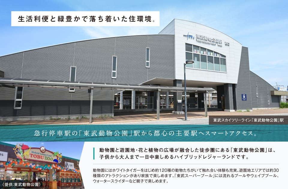 - 東武スカイツリーライン「東武動物公園」駅へ徒歩8分。駅近の利便性を享受しながら緑豊かなまちで大らかに暮らしませんか。