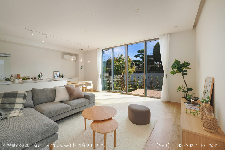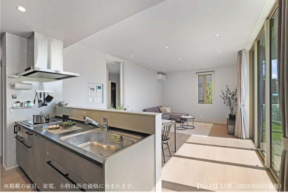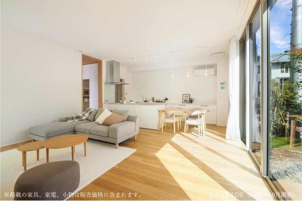 さえぎる壁のない広々としたLDKは、導線はもちろん、リビングで遊ぶお子様を見ながらの家事やコミュニケーションのとりやすさが魅力。南側の連続開口により採光と通風に優れ、家族みんなが寛げる空間です。