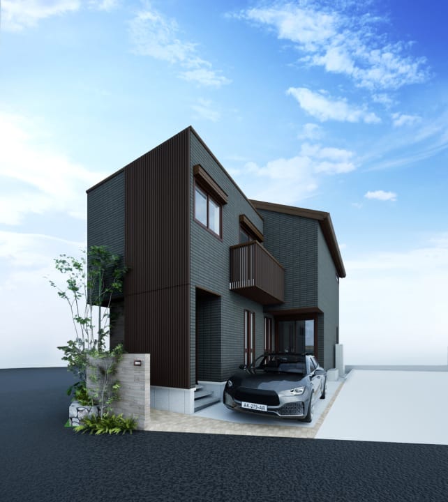 【No.1/外観パース】落ち着いた街並みが広がる、第一種低層住居専用地域に位置しています。積水ハウスの木造住宅「シャーウッド」。石積み・植栽など、自然素材の温もりを楽しむ住まいです。