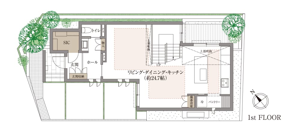 ※植栽は、竣工からの生育期間(約2年を想定)を経た枝ぶりや樹形を想定して描いております。