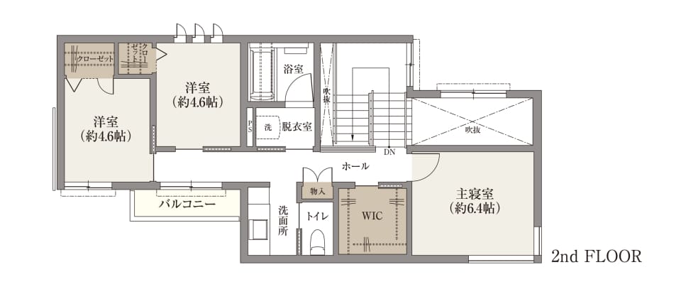 【No.1/2階平面図】洗面室と浴室を2階に配置。洗濯や、入浴から就寝までの動線がスムーズです。WICなど豊富な収納で、すっきりとした住空間を保てます。