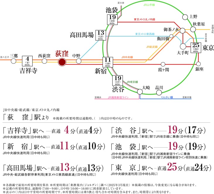JR中央線・総武線、東京メトロ丸ノ内線 「荻窪」駅から、「新宿」駅へ11分、「東京」駅へ25分。