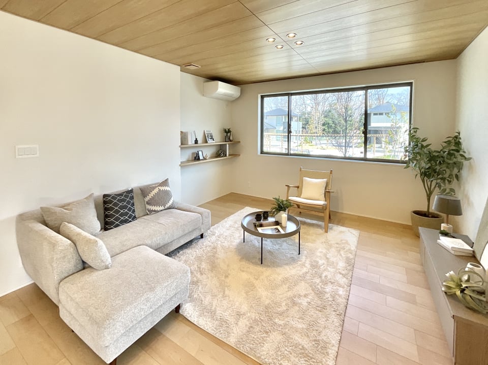【No.60/リビング】目の前の公園を見渡せる窓を設け、穏やかな眺望が望めます。天井は木彫とし、落ち着きのあるリビングとなっております。/2026年3月撮影