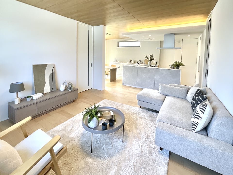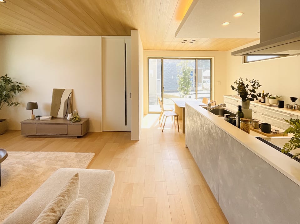【No.60/キッチン】間接照明のやわらかな光が、空間に落ち着きと奥行きをもたらします。キッチンからリビング全体を見渡せ、自然と会話が生まれやすい開放的なレイアウトです。/2026年3月撮影