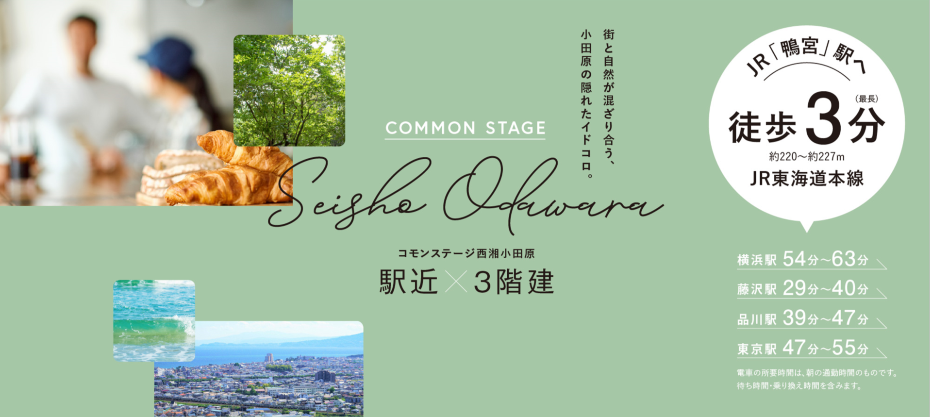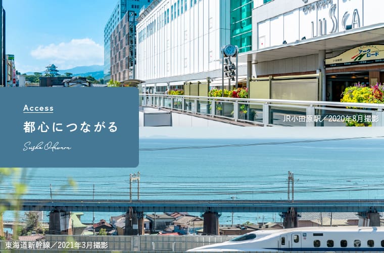 ![]() Access 現地から徒歩約3分(最長)の「鴨宮」駅は、 「小田原」駅まで1駅。 新幹線も利用できる主要駅へ簡単にアクセスできます。 都心への通勤通学も、遠方への家族のお出かけも。 各地とつながる交通利便性が、 新しい暮らしを便利に楽しく彩ります。 |