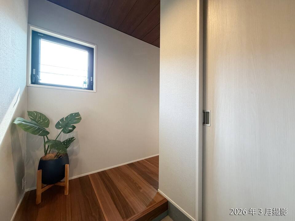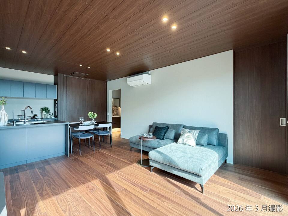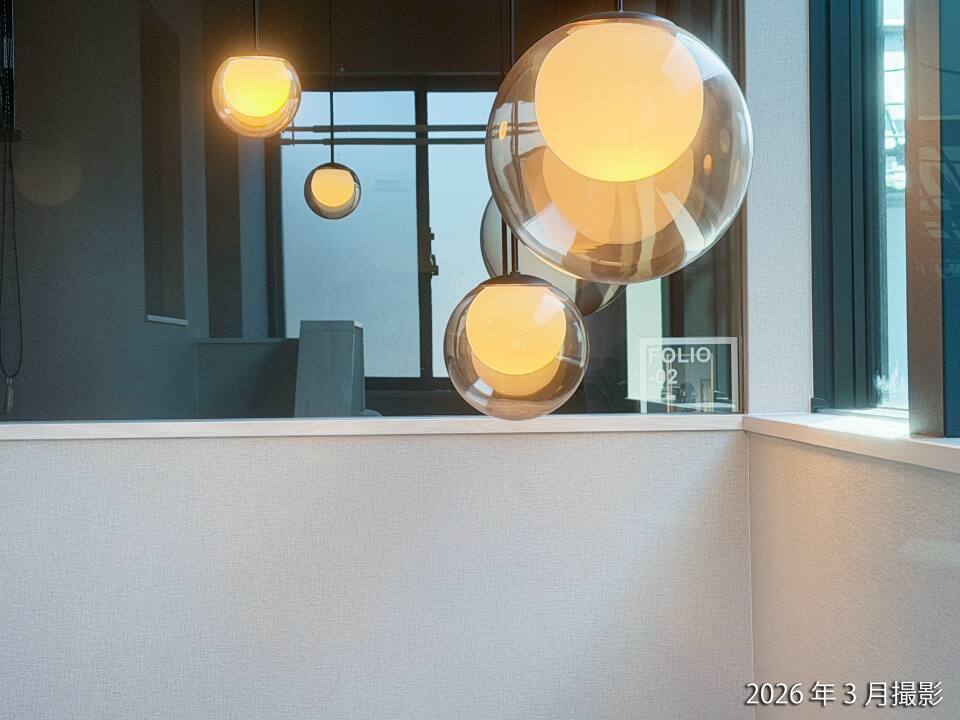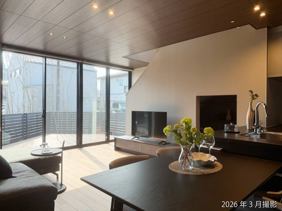 大開口のサッシからあふれる光は、リビングいっぱいへと静かに流れ込みます。光と家族が調和する、優しくて、どこまでも心地よいリビングです。