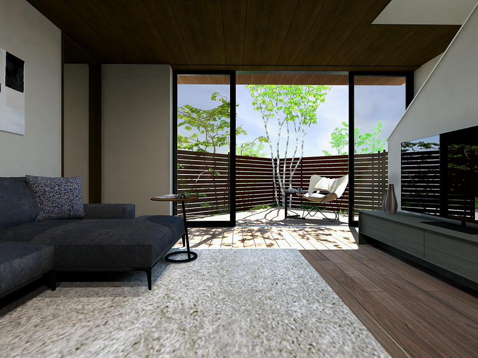大きな木陰のようなリビングでの暮らしは、自然の情景が思い出される。