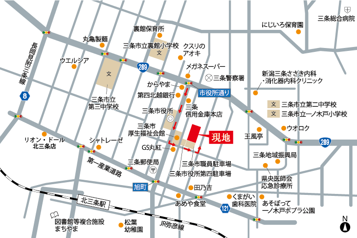 三条市の中心街に位置し、小学校、図書館などの教育施設をはじめ、医療施設も近くに揃うロケーションです。