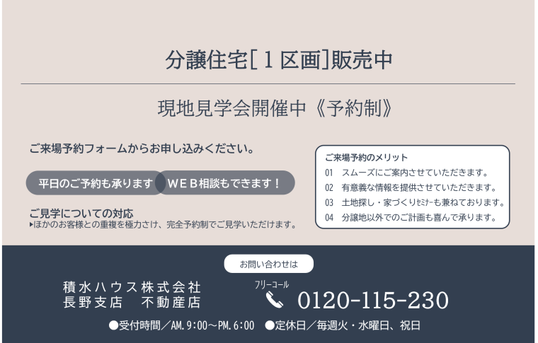 積水ハウス株式会社 長野支店定休日:火曜日、水曜日、及び祝日 営業時間:9:00~18:00