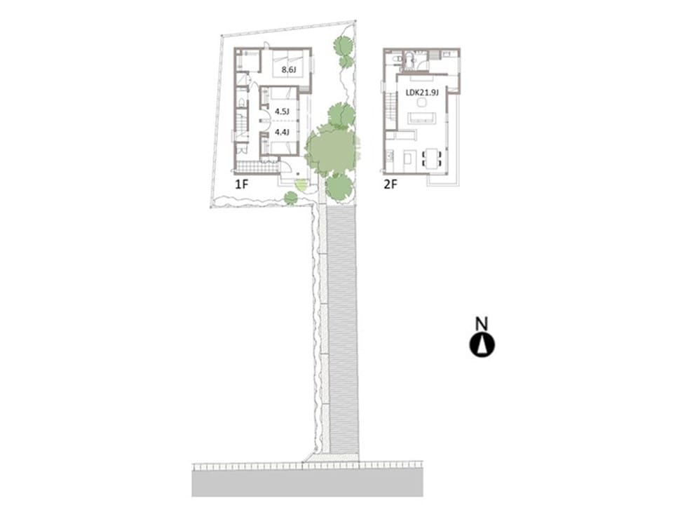 大小さまざまな木々が建物を彩る、立体感のある外構デザイン。駐車スペースには緑化ブロックを採用し、足元にも自然の潤いを添えました。毎日の水やりをサポートする灌水機を備え、無理なく美しい緑を保てます。
