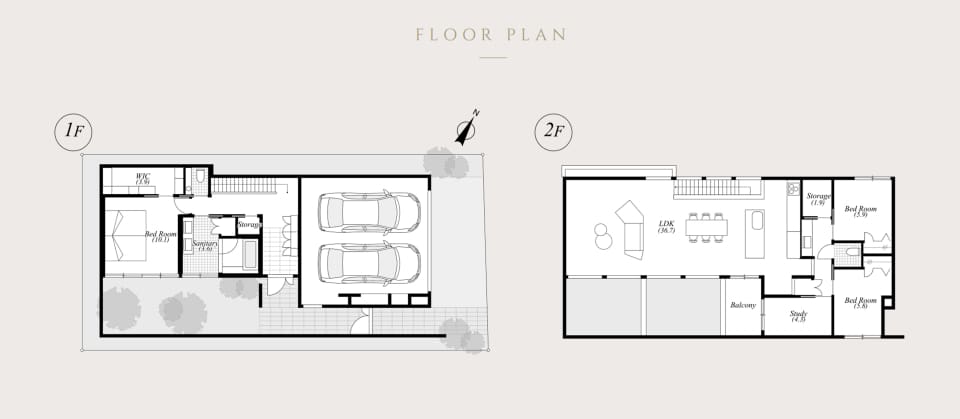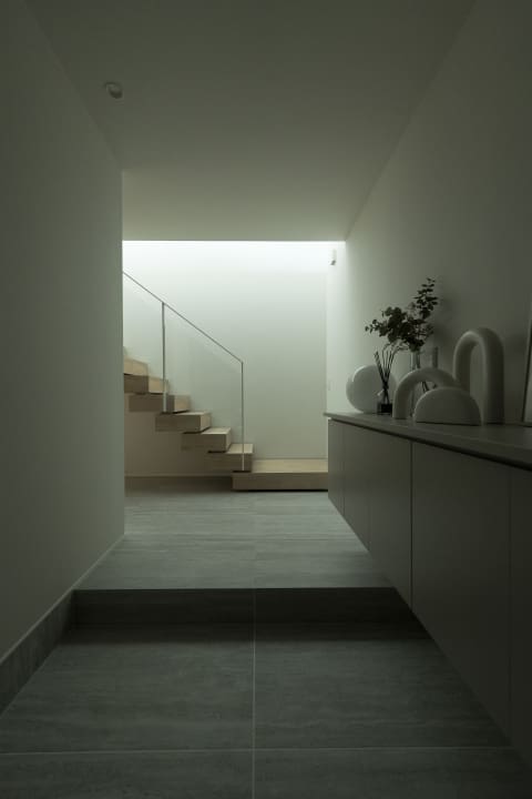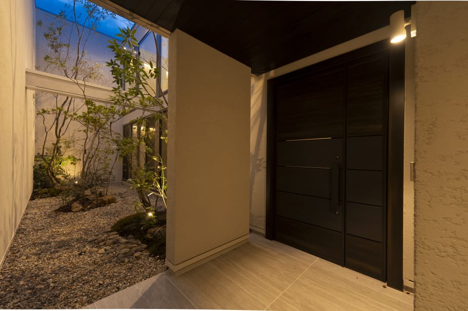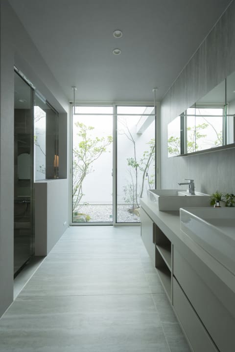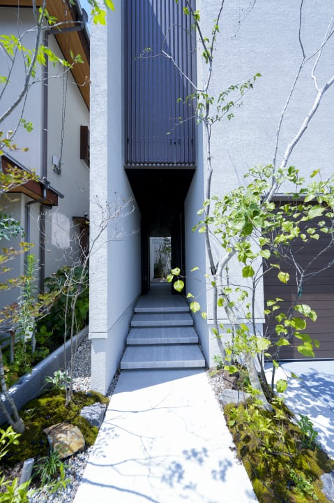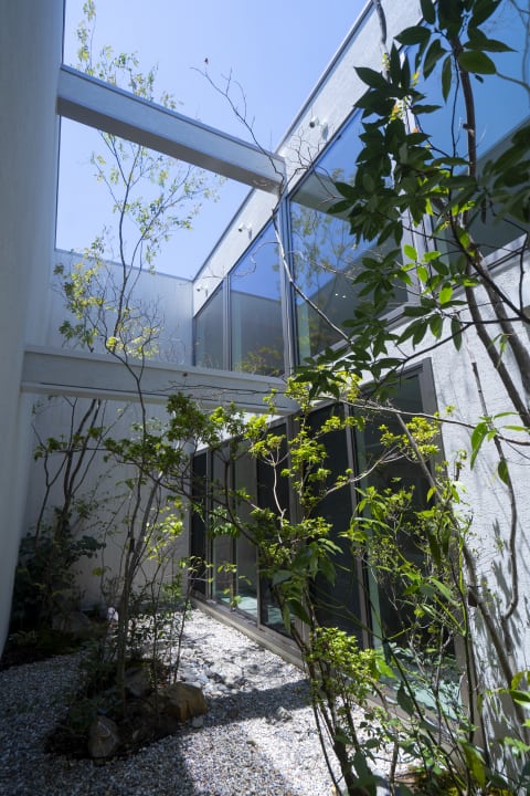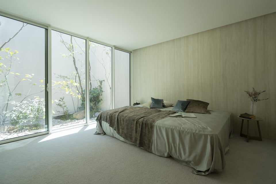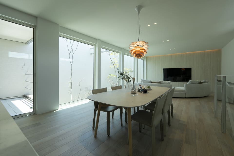 中庭の緑を感じながらプライバシーを確保できる中庭のあるコートハウス。LDKを2階に配置することで、LDK36帖の広さと、中庭からの木々の緑と切り取られた空を眺めて暮らす豊かな暮らしを実現。寝室・サニタリーが中庭に面し、カーテンレスの生活が満喫できます。