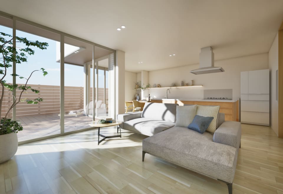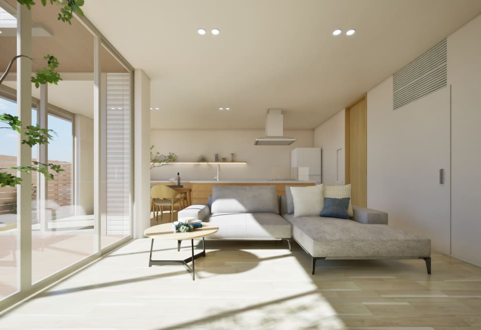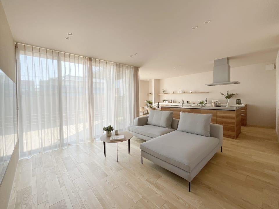 南東の広々とした庭をL型に囲むLDKに大開口サッシから心地よい陽光が差し込みます。ゆったりとしたリビングは庭と穏やかにつながるくつろぎの空間です。