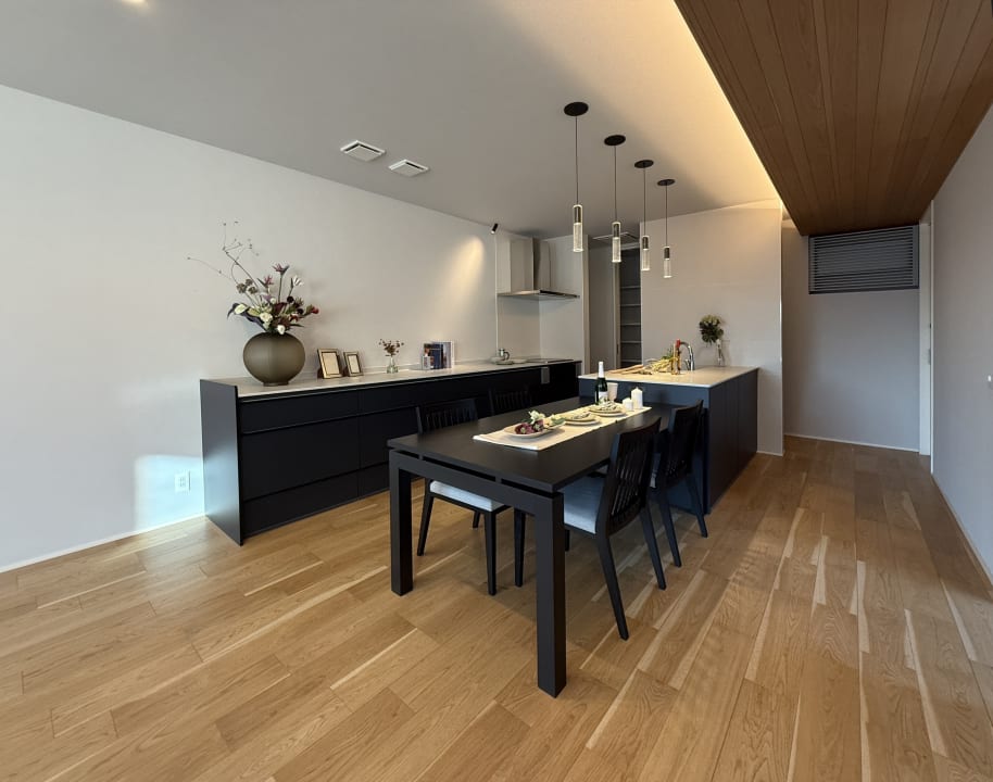 間接照明と柔らかな木目のアクセント天井がくつろぎ空間を演出します。
