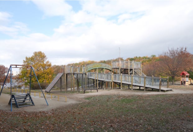 大根池を囲む3つの小山を含む都市公園。園内中央には大型アスレチック遊具が設置されていて、全長30mほどのローラー滑り台に子供たちが列を作ります。