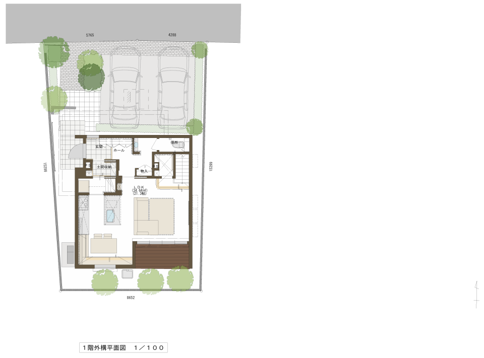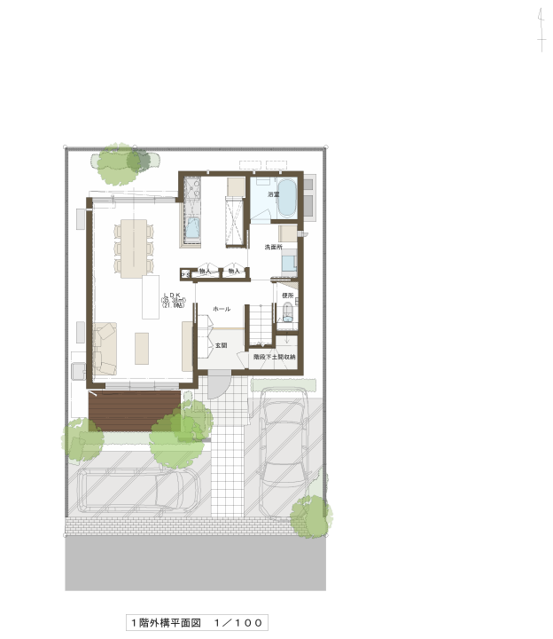 天井高270cmのダイナミックなLDK、奥行2mの軒下空間、奥庭に接するキッチン空間、それぞれの居どころがありながら、家族を感じることができるちょうどよい距離感のある空間。目的に合わせた多彩な収納計画も魅力的です。