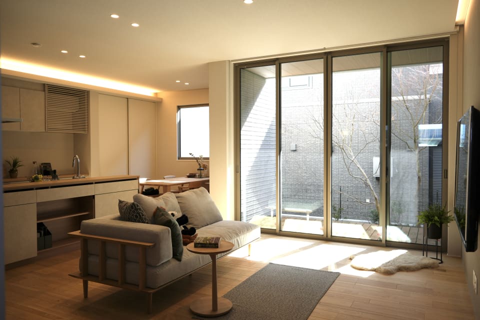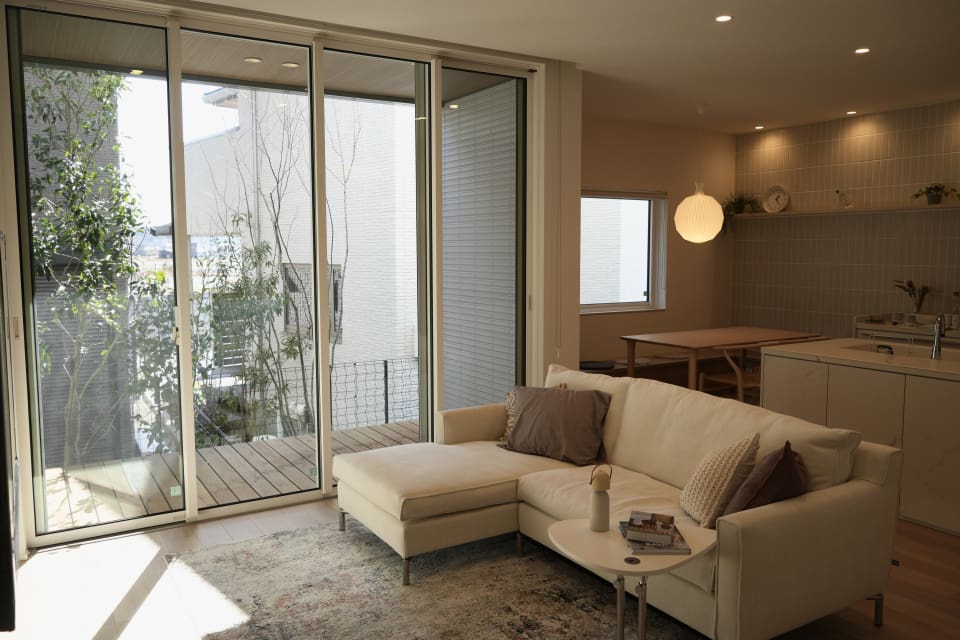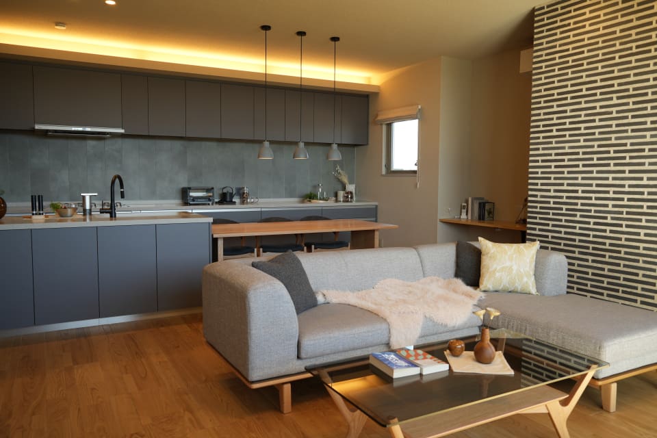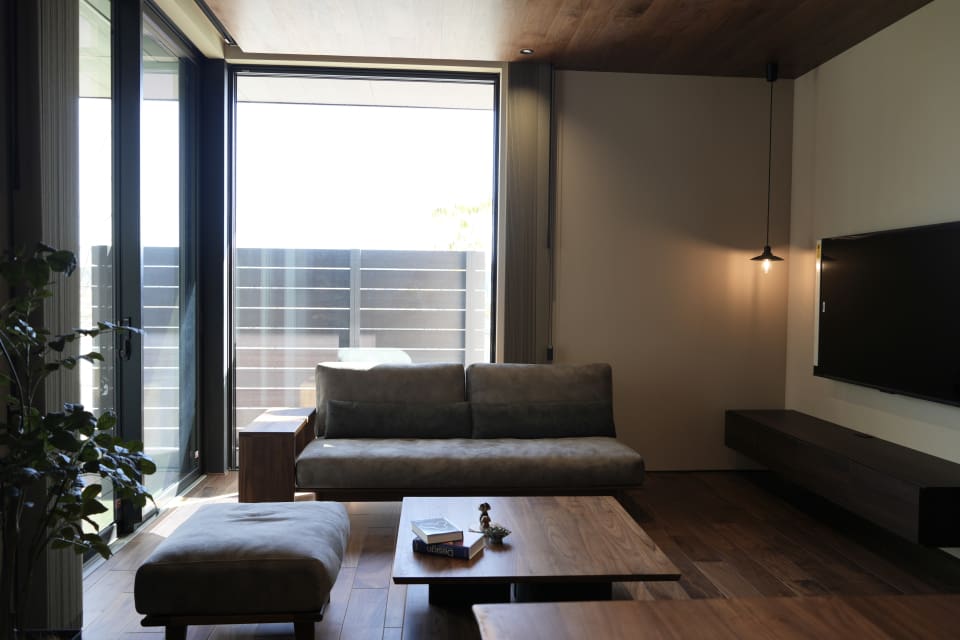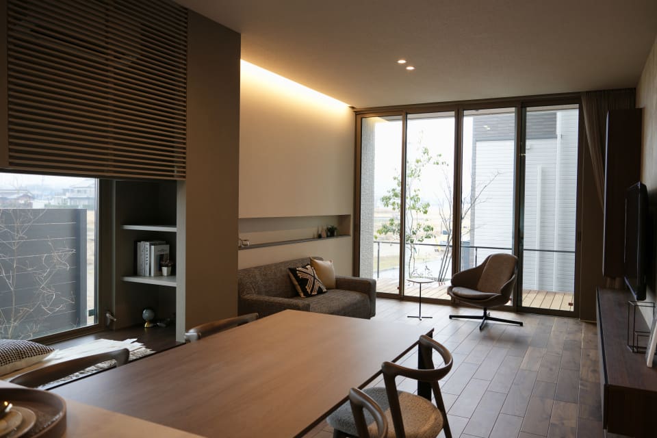 34坪の大きさで4.5m×4.5mのリビング及び天井高270cm且つコーナーの大開口サッシが実現できる構造の優位性を体感いただけます。要所に家族の居どころを設け、内外を繋ぎながら「優」のインテリアで空間を包み込みます。