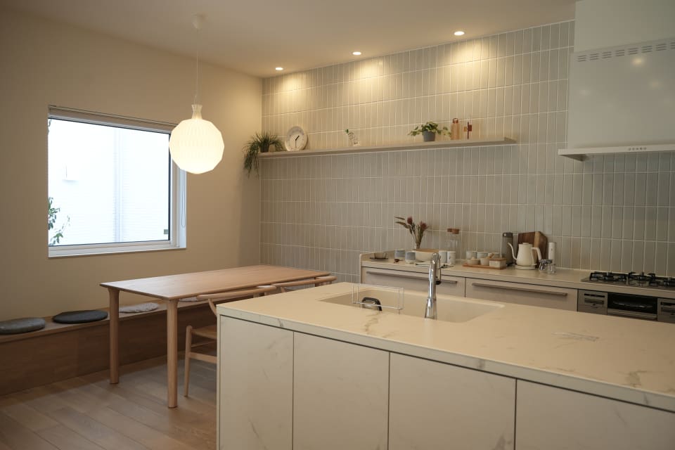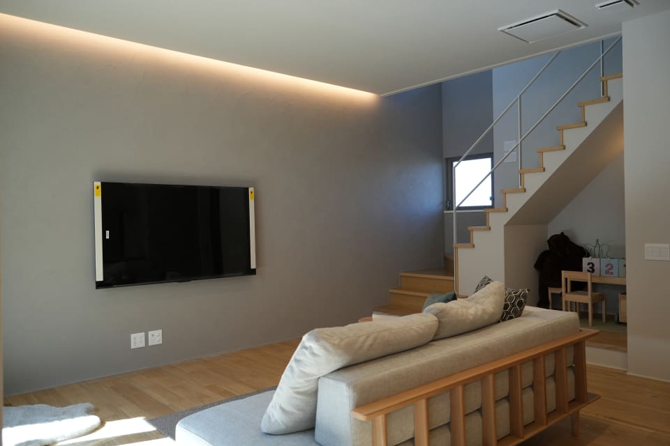 家族がそれぞれの居どころにいながら、自然と会話も生まれるちょうどよい距離感があるリビング・ダイニングにヌックを設けることでプラスαのイドコロ空間が生まれました。家族動線を意識した土間収納・サニタリースペースにより、自然と自分時間が生まれ、趣味や家族と過ごす時間に費やすことができる計画としています。