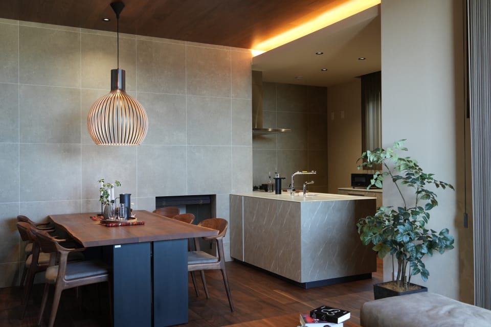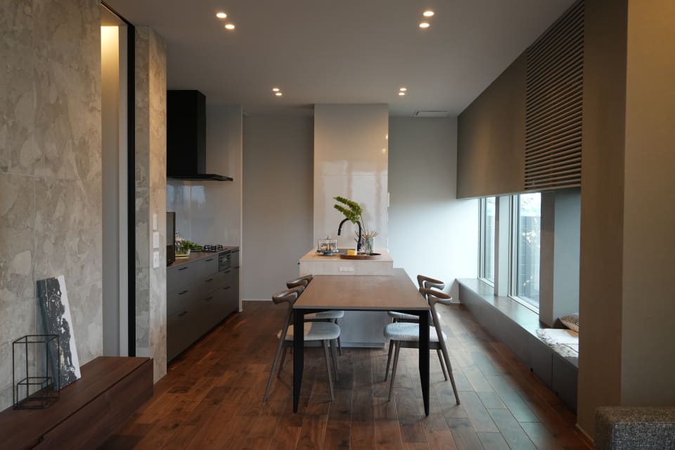 空間を一体にしたゆとりのあるLDKを計画しつつも、気分によっては家族と過度な距離感を保てるようなゾーニングとし、プラスαとしてヌックを配置しました。北側の吹抜けから差し込む優しい光が落ち着きのある上質な空間を演出します。