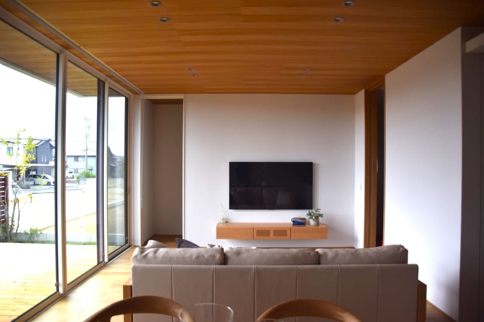 ・室内天井と軒裏を木質にすることで内と外の境界があいまいとなり、空間の広がりを感じられます。