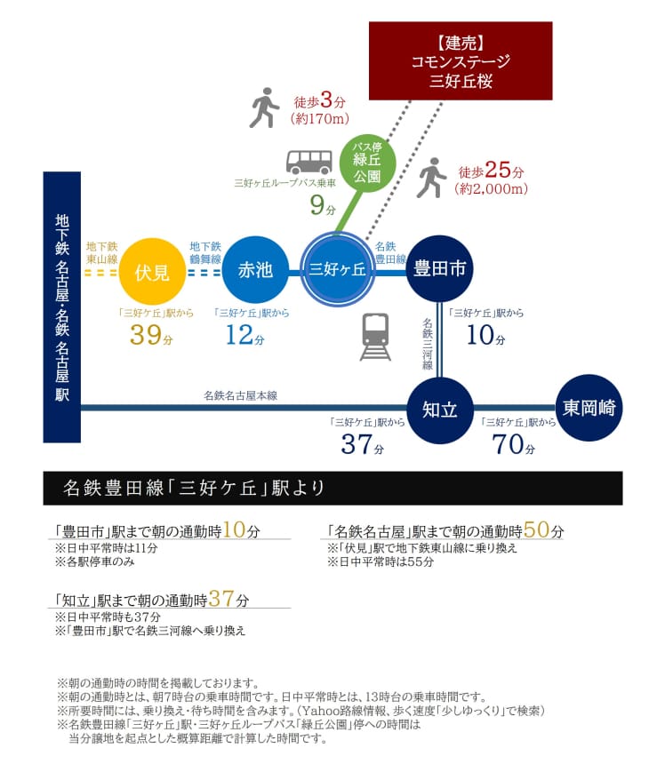 名鉄豊田線「豊田市」駅まで乗車10分。「名鉄名古屋」駅まで乗車50分(※伏見駅で乗り換え)