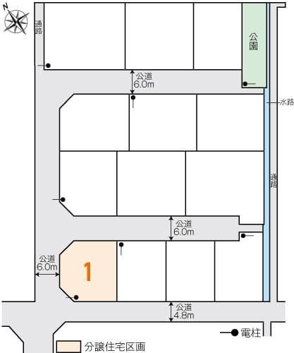 全体区画図/幅員6mの道路があり、敷地と道路に段差が少ないため車の入出庫もスムーズに行えます。また南方面からの明かりを取り込みやすい立地となっております。