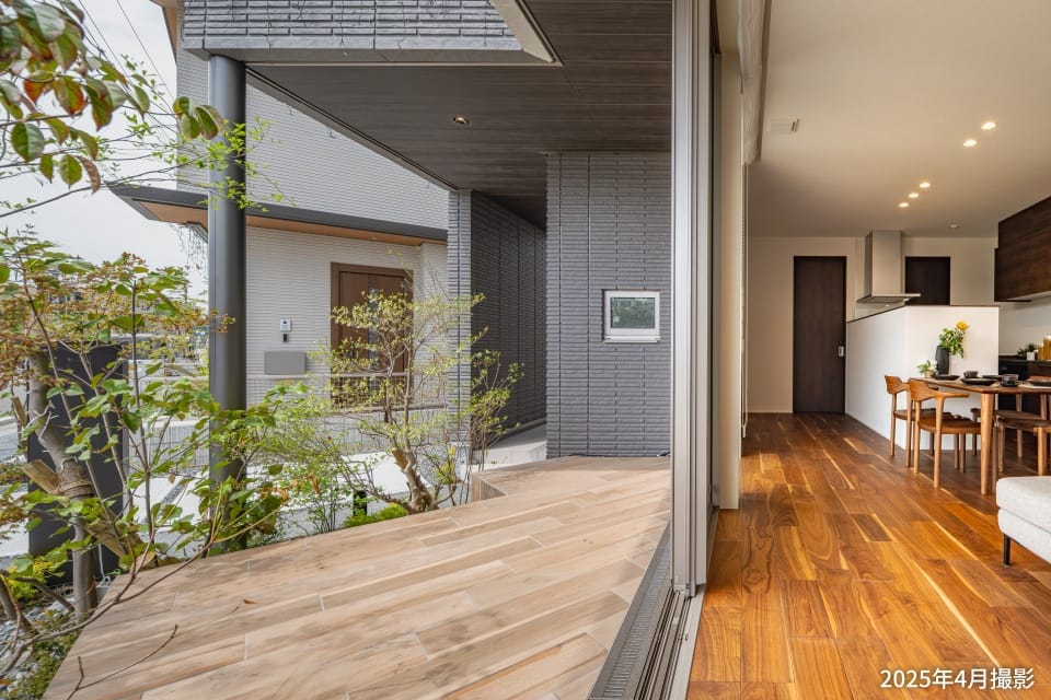 【8-20号地/ウッドデッキ】リビングからフラットにつながるウッドデッキ。開放的な気分を味わうことができ、気分転換やペットの日向ぼっこなど、暮らしの楽しみが広がる空間です。/2025年4月撮影
