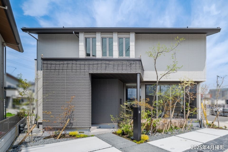 【8-20号地/外観】積水ハウスの外壁「ダインコンクリート」を採用。光と影が織りなすデザイン性と、汚れが付きにくく美しさを保つ機能性を両立しています。/2025年4月撮影