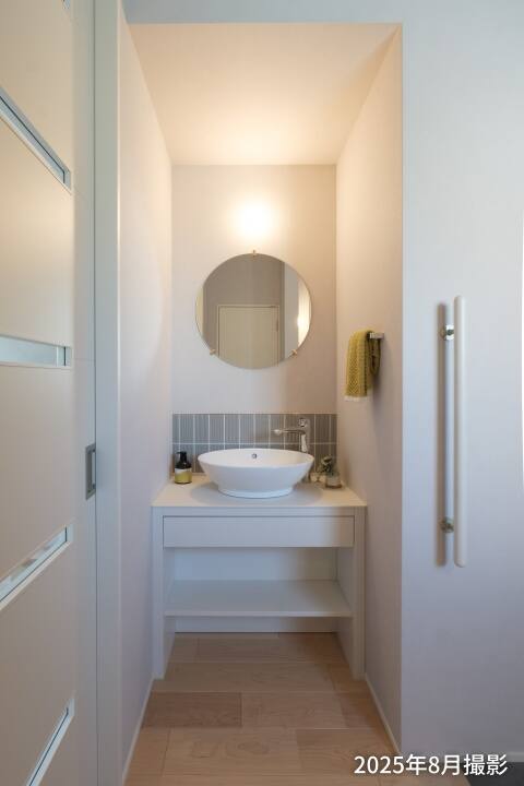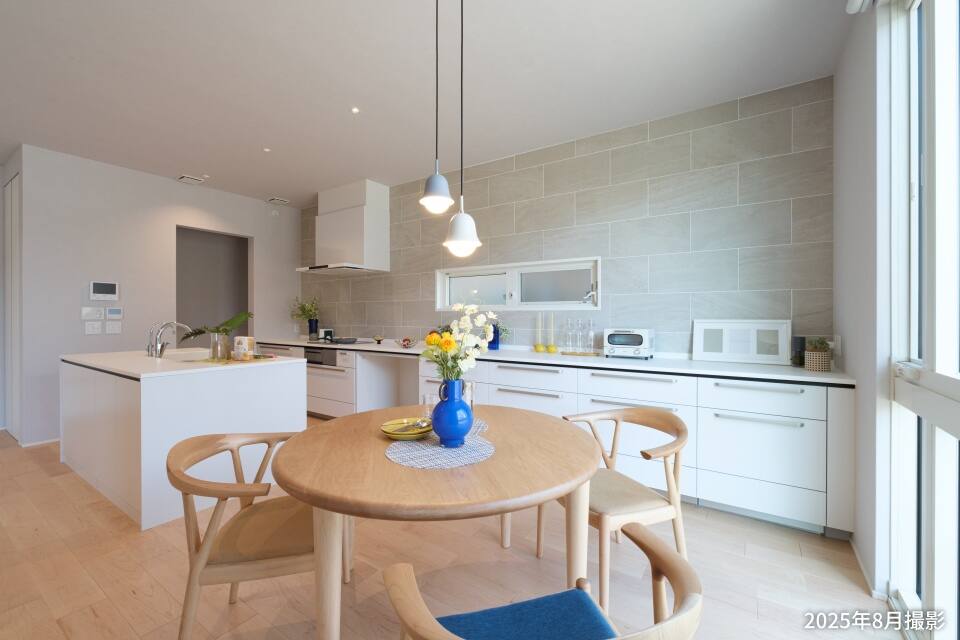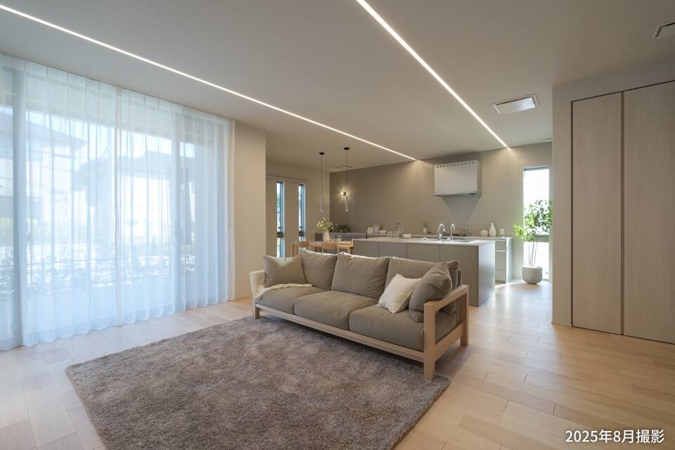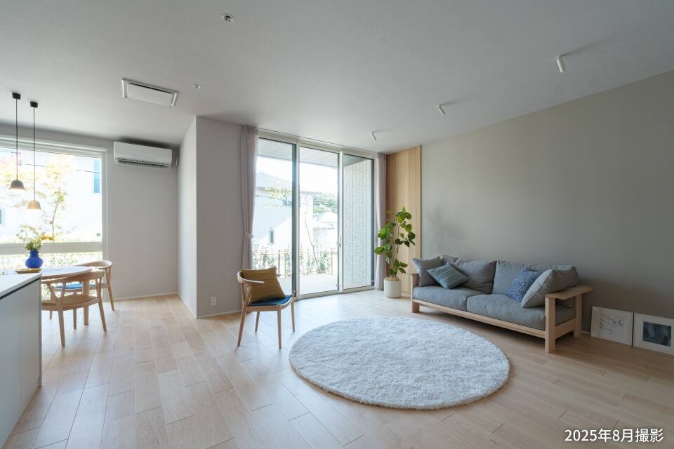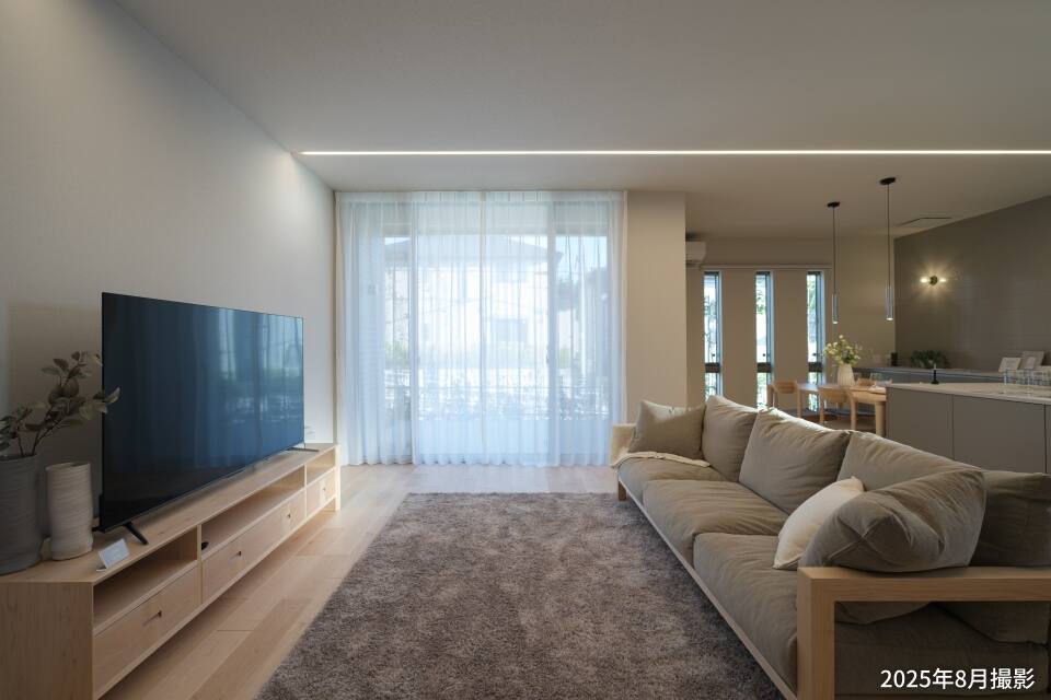 【32号地/外観】感性テーマは「奏」。色やカタチの個性を引き立てるすっきりとした空間。変化を楽しみ、自由な感性で彩る柔軟な住まいです。/2025年8月撮影