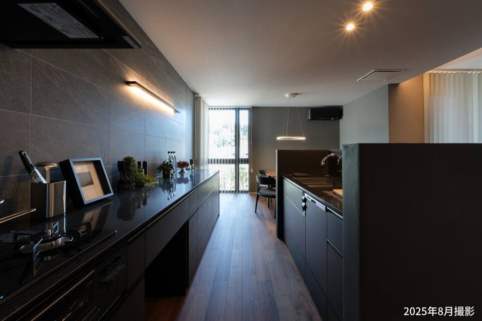 【30号地/外観】感性テーマは「艶」。重厚感とダイナミックさを表現。空間にゆとりや、ゆっくりとした時間の流れが感じられる住まいです。/2025年8月撮影