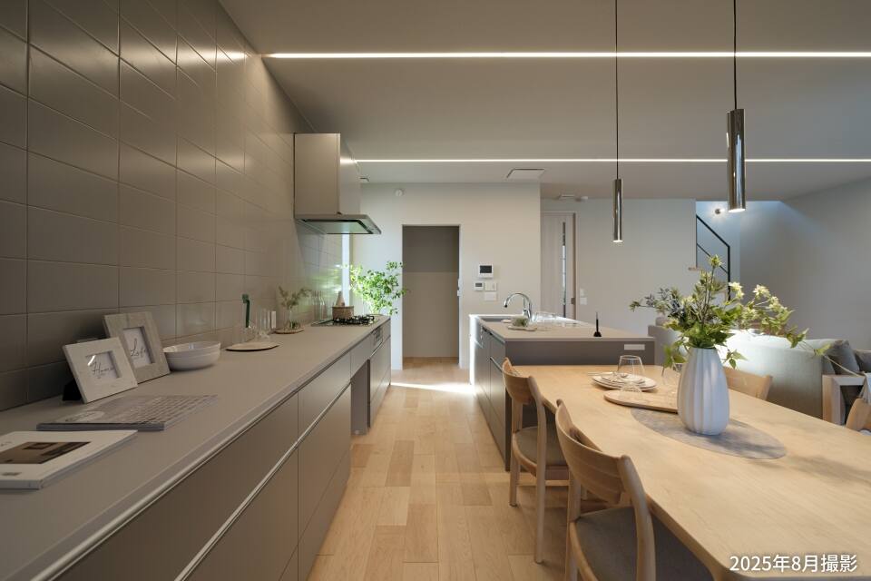 【32号地/外観】感性テーマは「奏」。色やカタチの個性を引き立てるすっきりとした空間。変化を楽しみ、自由な感性で彩る柔軟な住まいです。/2025年8月撮影