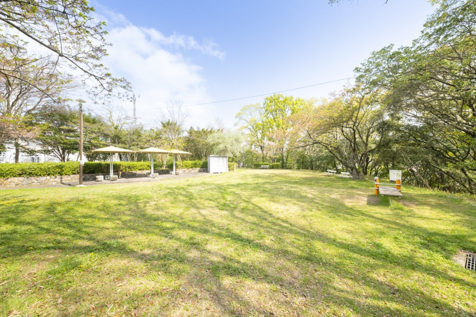 傾斜地にあり、斜面を利用した大きな滑り台が設置されています。ブランコや鉄棒、フェンスで囲まれたグラウンドもあり、景色を楽しみながらのびのびと遊ぶことができます。