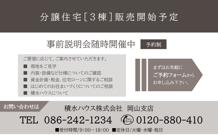 積水ハウス株式会社  岡山支店定休日:火曜日、水曜日、及び祝日 営業時間:9:00~18:00