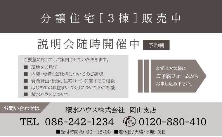 積水ハウス株式会社 岡山支店定休日:火曜日、水曜日、及び祝日 営業時間:9:00~18:00