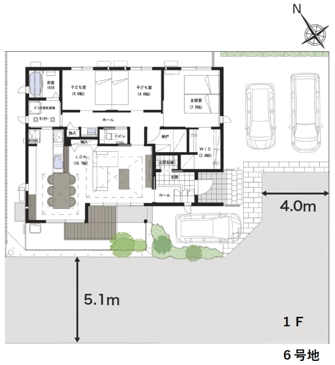 ※プランや写真に掲載されている家具・家電・小物類は、レイアウトの参考例であり、分譲価格には含まれておりません。植栽は、予定されている樹種の約5年後を想定したイメージです。販売時には苗木や緑量が少ない状態でのお引渡しとなり、植栽の成長には数年を要する場合があります。