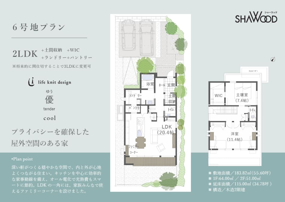 ■敷地面積/183.82㎡(55.60坪)■1F:64.00㎡ / 2F:51.00㎡/延床面積/115.00㎡(34.78坪)