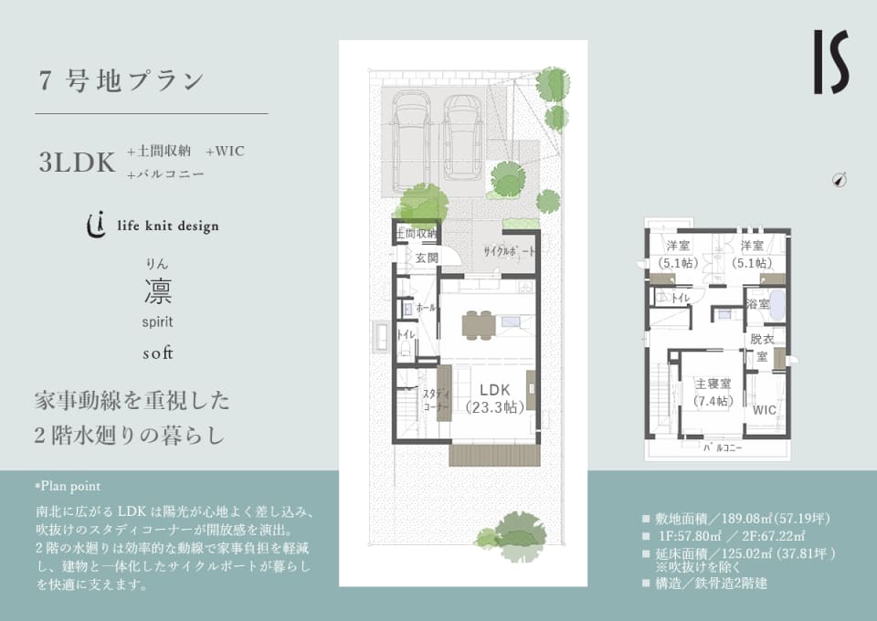 ■敷地面積/189.08㎡(57.19坪)■ 1F:57.80㎡ / 2F:67.22㎡/延床面積/125.02㎡(37.81坪)※吹抜けを除く