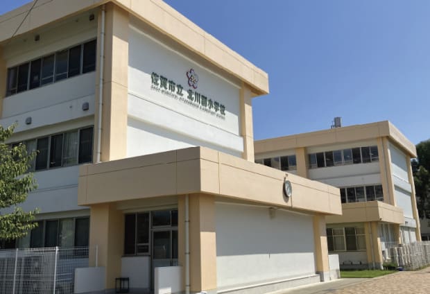 「えがお かがやく 子ども を育てる チーム北川副 〜誰もが大切にされる学校を目指して〜」を学校教育目標にした小学校。