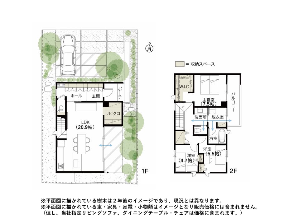 ※平面図・パースに描かれている車・家具・家電・小物類はイメージとなり販売価格には含まれません。(但し、当社指定リビングソファ・ダイニングテーブル・チェアは価格に含まれます。)