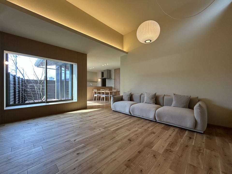 家事効率の良い回遊動線や収納など快適な暮らしを考慮した設計。窓ベンチのあるリビングで、家族がつながる平屋の住まい。