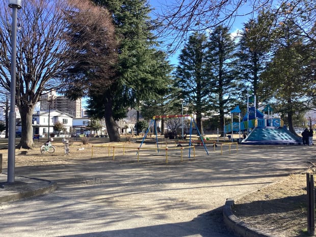 緑に囲まれて、広い遊び場と遊具もある公園です。