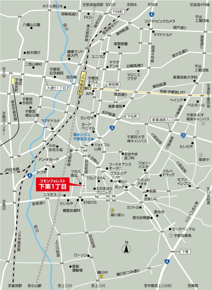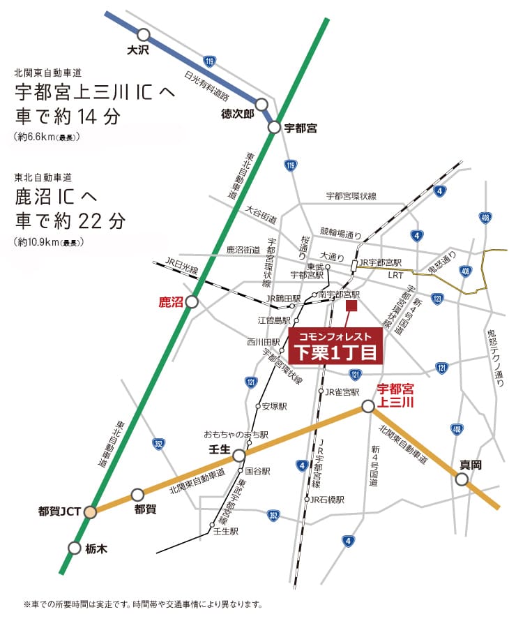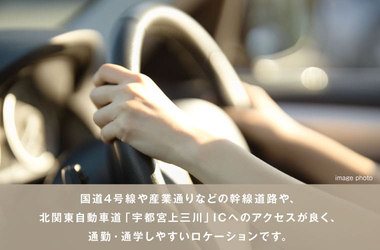 車での移動は、国道4号線や新4号国道・城東通り・産業通り・真岡街道などの幹線道路や北関東自動車道「宇都宮上三川IC」へのアクセスが良く、快適なカーライフを送ることができます。