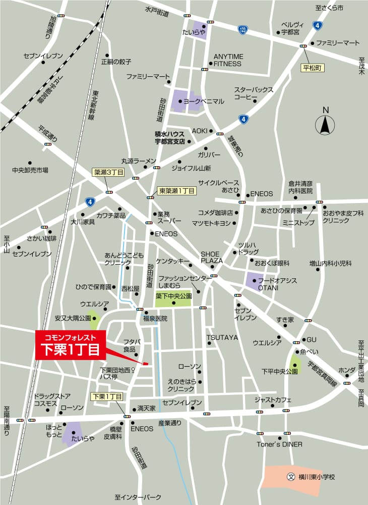 JR宇都宮駅東口の「宇都宮テラス(車で6分/約2,630m〜約2,660m)」や「ショピングモールベルモール(車で9分/約4,300m〜約4,330m)」などの大型商業施設へのアクセスも良く、さらにJR宇都宮駅や国道4号線などへの交通アクセスも良く、様々な世代が暮らしやすい立地です。