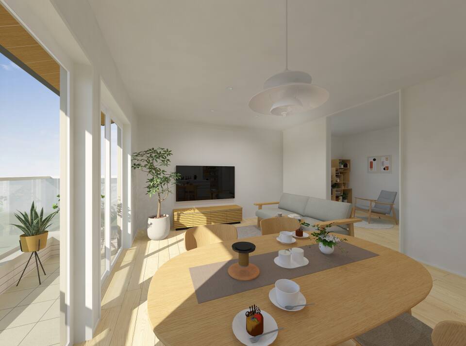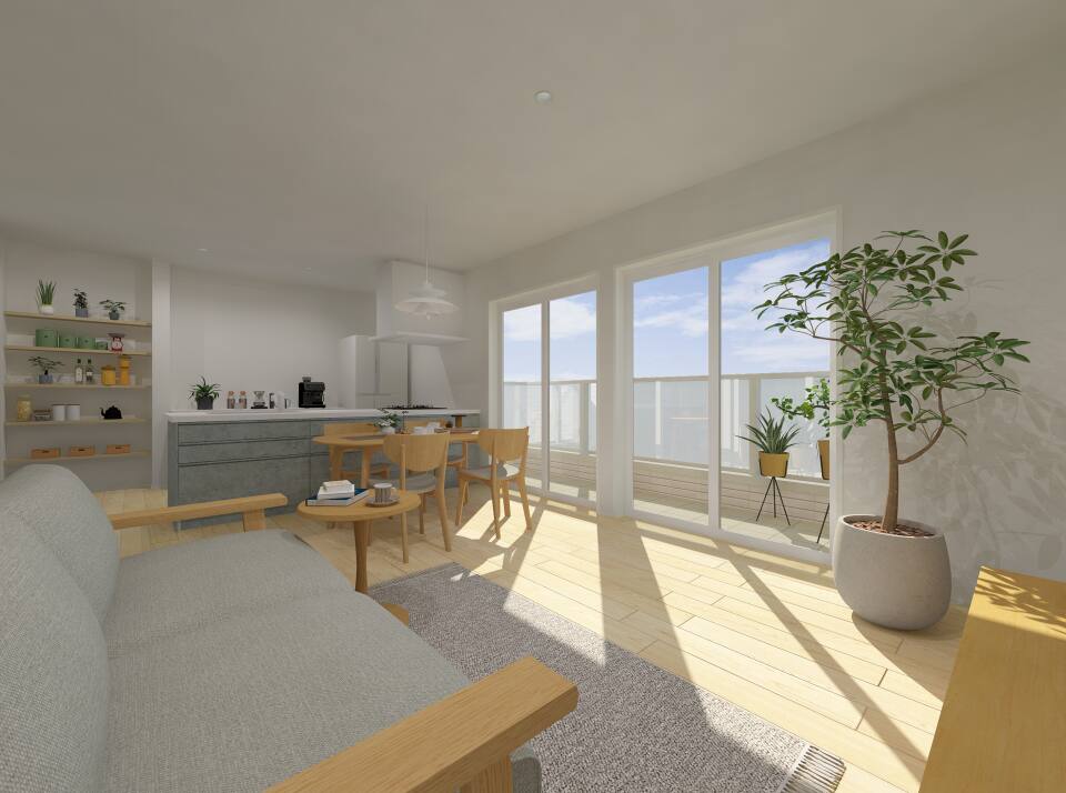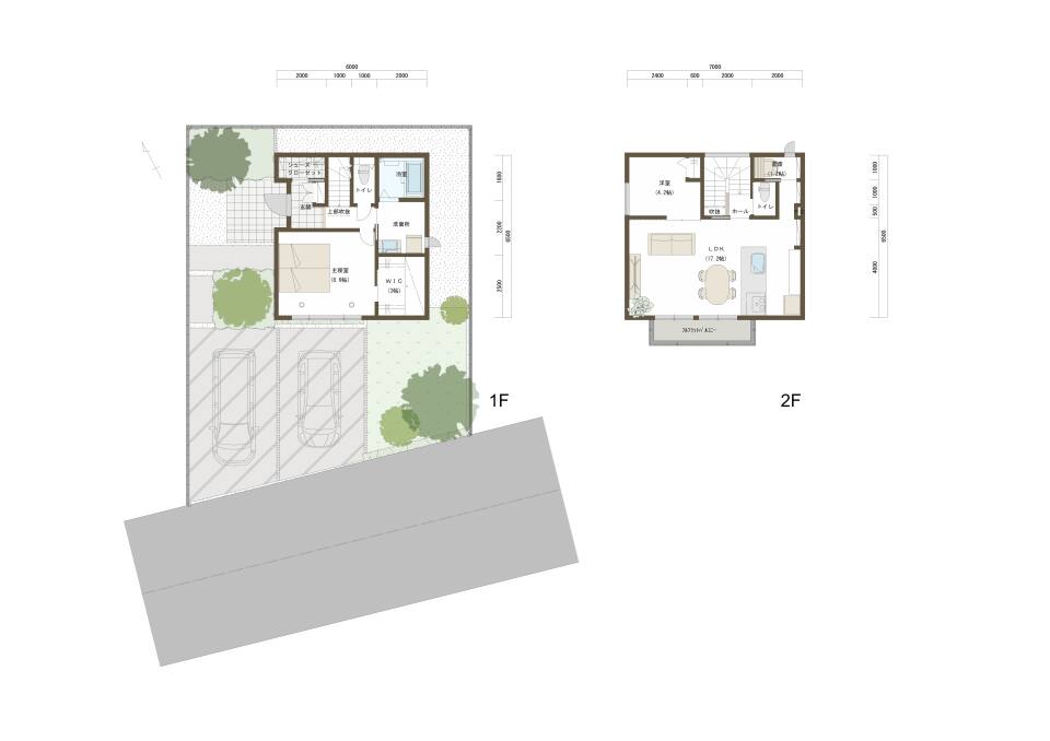 ※外観パース、内観パースは参考プランを基に描き起こしたイメージパースです。外構図に書かれている植栽の様子には、3年後のイメージに近い画像を用いておりますが、販売時は、苗木や緑量の少ない状態となります。植栽の育成には数年を要するものもありますし、成長後の形状も様々となります。