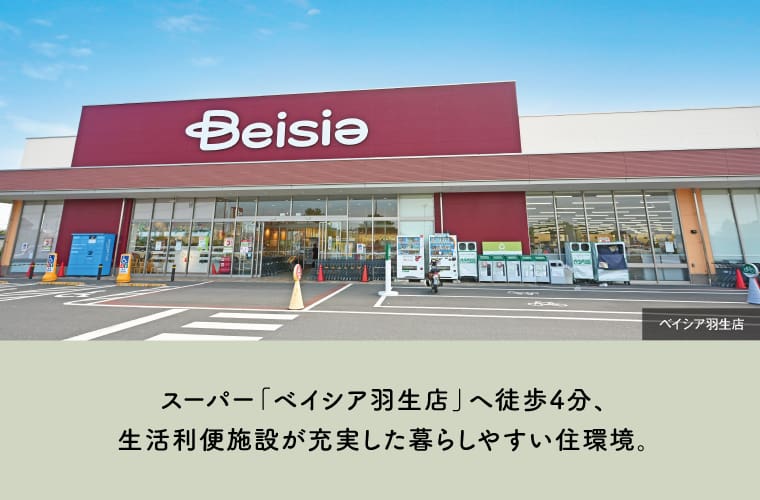 ![]() 毎日のお買い物は徒歩圏にある2つのスーパーが便利。周辺には複合商業施設や、ロードサイド店舗など充実の利便施設があります。病院もあり、子育て世代が安心してのびのびと暮らせるロケーションです。●ベイシア羽生店(徒歩4分/約260m〜約270m)●ベルク羽生西店(徒歩7分/約490m〜約500m)●フォルテ羽生(徒歩19分/約1450m〜約1460m)●カインズモール羽生(徒歩19分/約1460m〜約1470m)●イオンモール羽生(車で7分/約3350m〜約3360m)●羽生総合病院(徒歩14分/約1070m〜約1080m) |